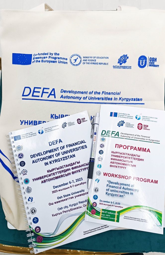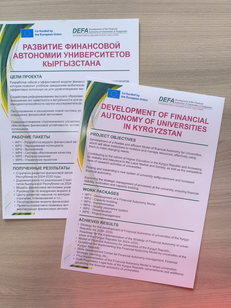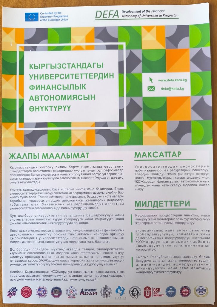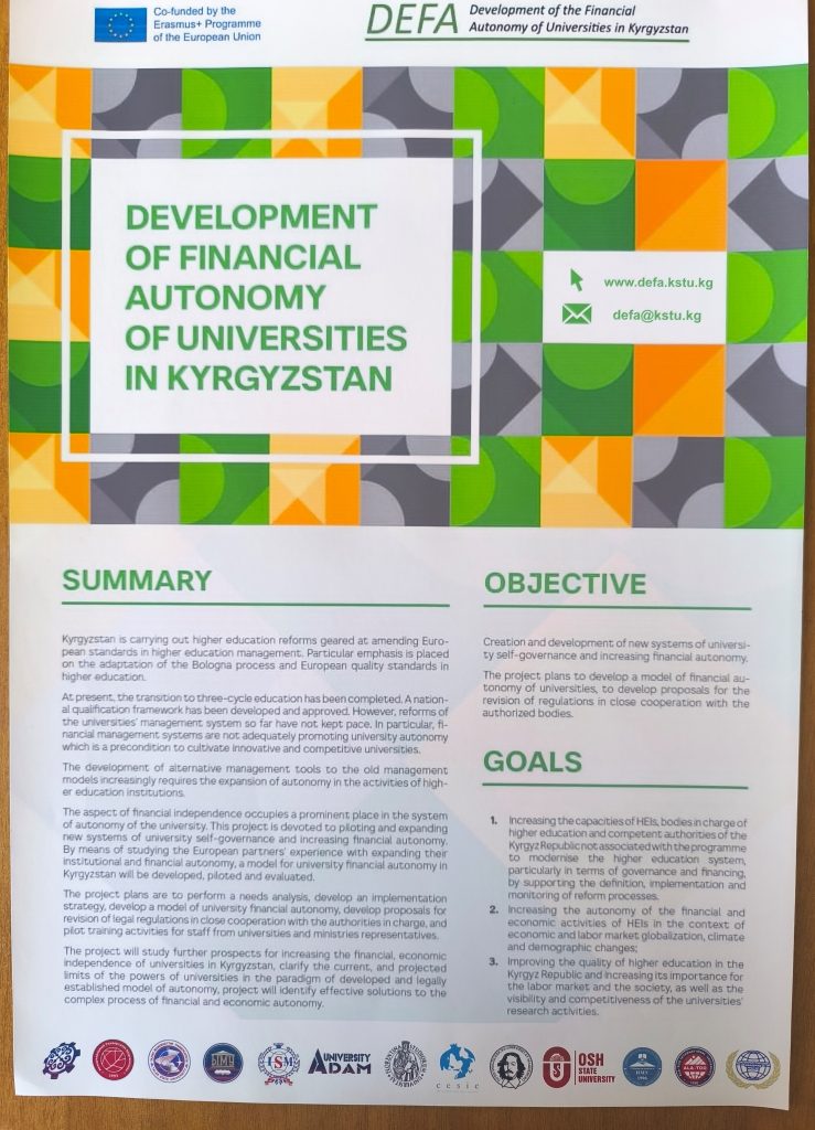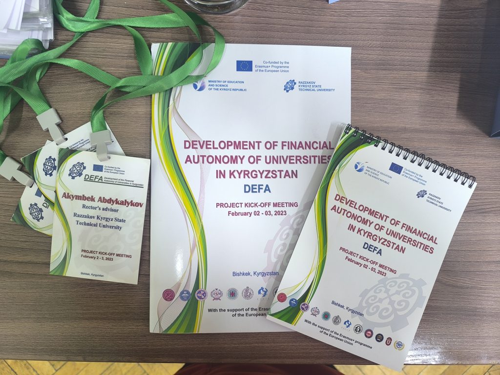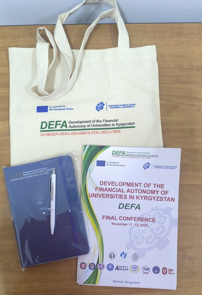 Финальная конференция проекта 11 ноября 2025 года, в Кыргызском государственном техническом университете имени И. Раззакова началась Финальная конференция проекта Erasmus+ “Развитие финансовой автономии университетов Кыргызстана (DEFA)”. Мероприятие проводится с целью подведения итогов трёхлетней работы проекта и обсуждения перспектив дальнейшего развития финансовой самостоятельности высших учебных заведений страны. В конференции принимают участие представители Министерства науки, высшего образования и инноваций КР, Министерства финансов КР,...