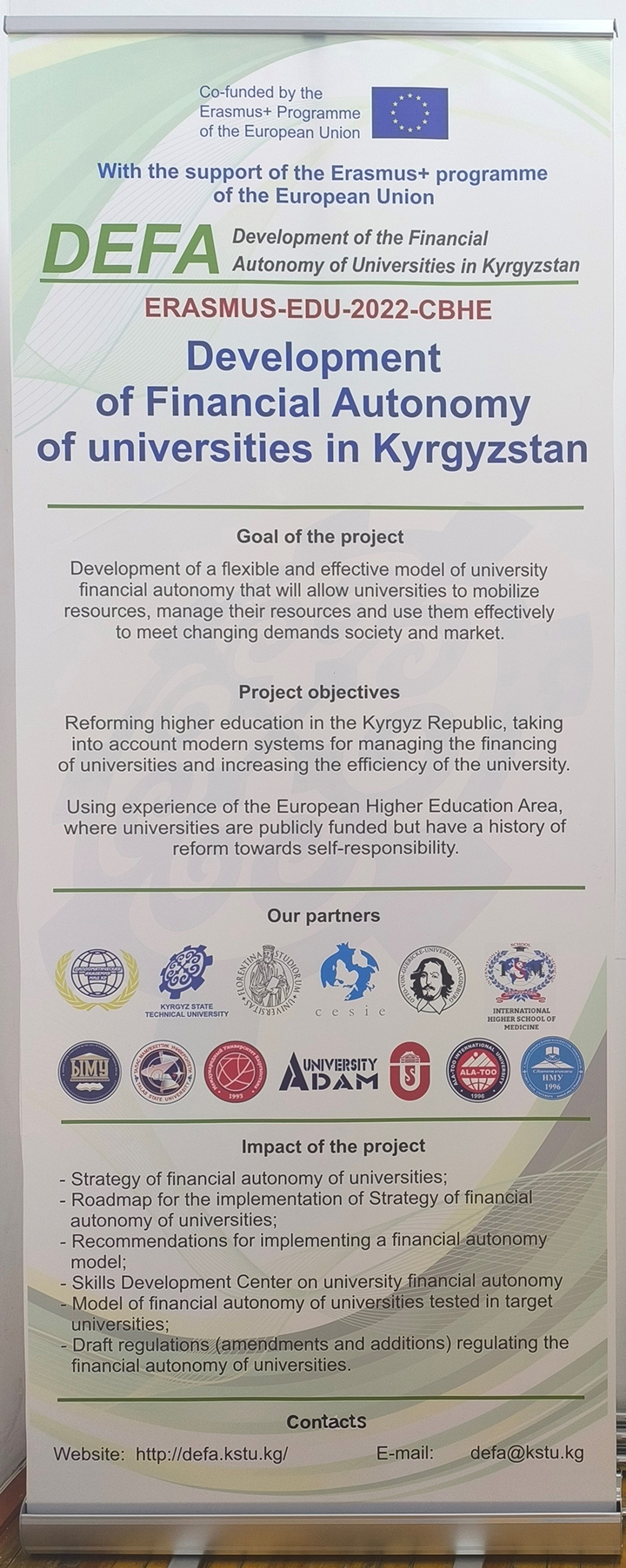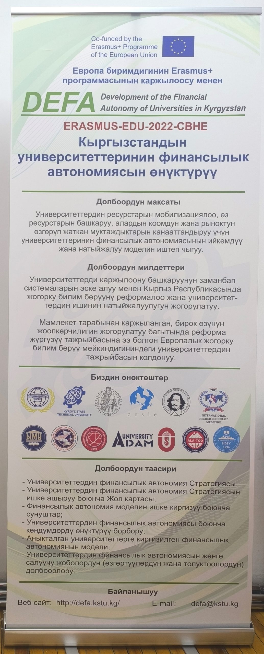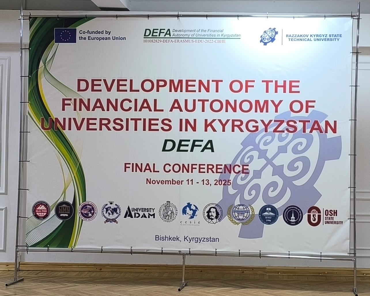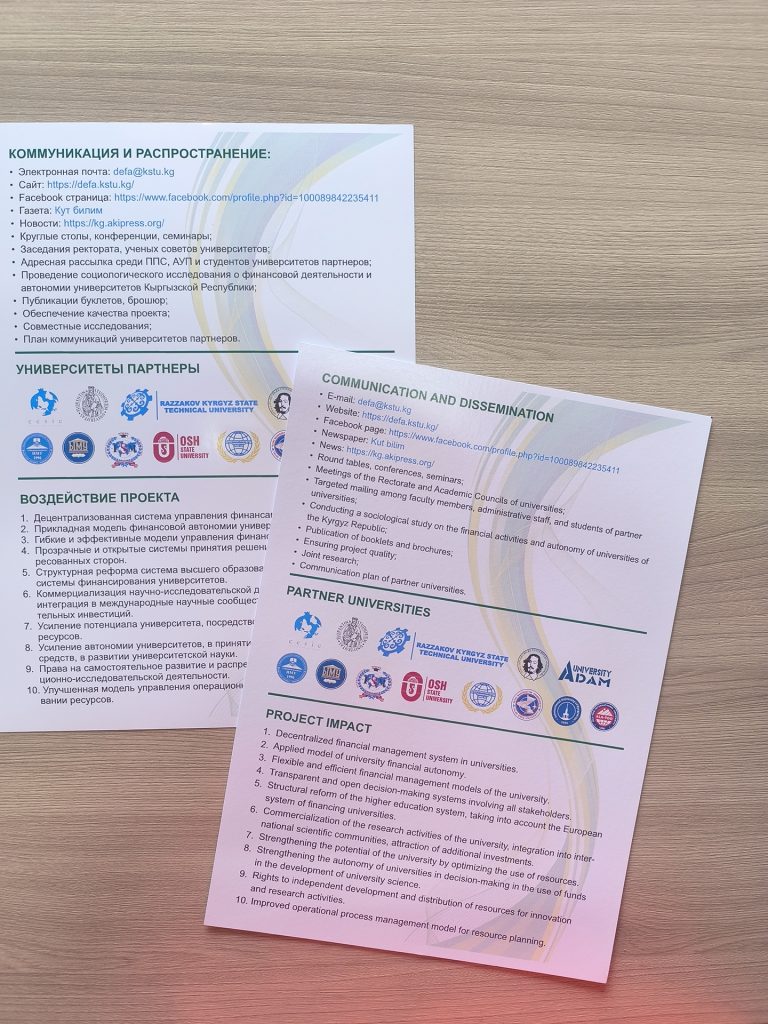 Финальная конференция проекта 11 ноября 2025 года, в Кыргызском государственном техническом университете имени И. Раззакова началась Финальная конференция проекта Erasmus+ “Развитие финансовой автономии университетов Кыргызстана (DEFA)”. Мероприятие проводится с целью подведения итогов трёхлетней работы проекта и обсуждения перспектив дальнейшего развития финансовой самостоятельности высших учебных заведений страны. В конференции принимают участие представители Министерства науки, высшего образования и инноваций КР, Министерства финансов КР,...